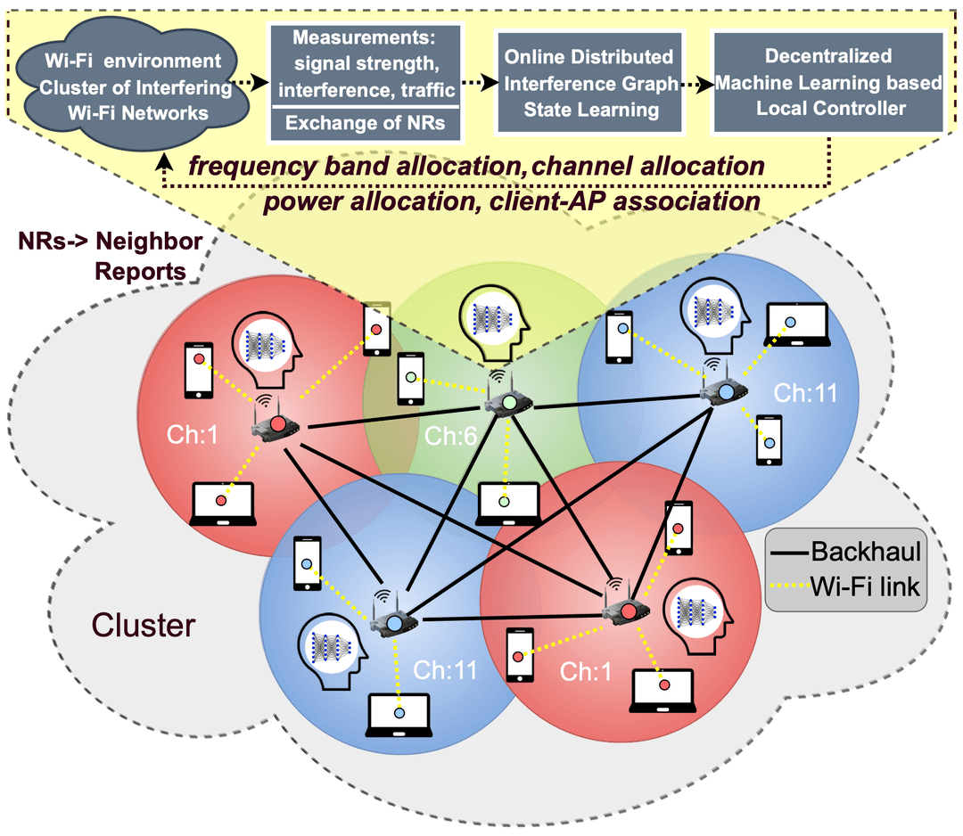 1) Novel distributed online ML algorithms to learn a multi-layer and multi-modal time-varying graph representing the overall dynamics of the interfering Wi-Fi networks, by using multivariate data time-series from APs & clients, detecting clusters of interfering Wi-Fi networks, allowing also to detect anomalies and predict variables.